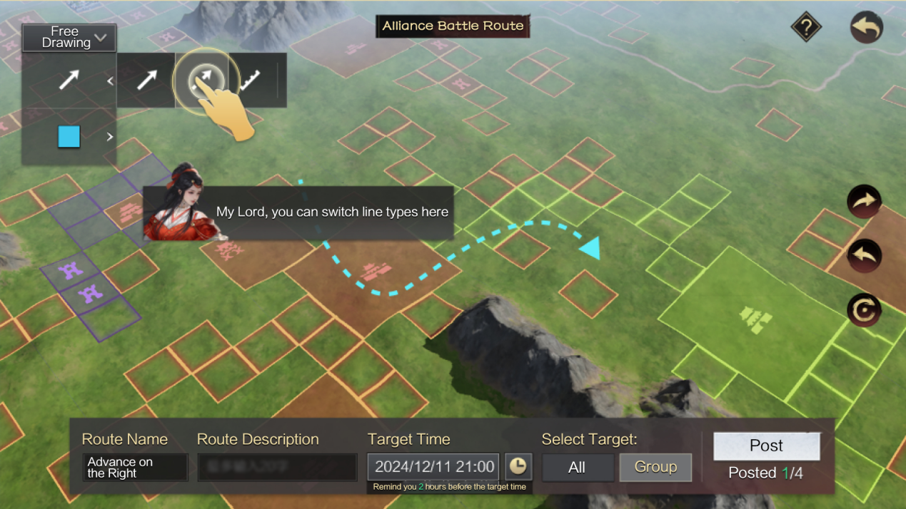 · Officials with corresponding permission from organizations such as Kingdoms, Alliances, Assemblies, and Lineages can tap any land in Strategic Mode to draw a battle route.