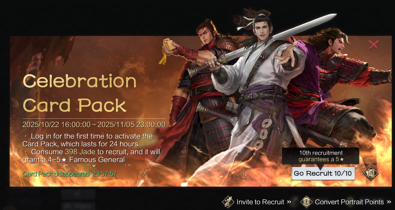 ·The 10th recruitment is guaranteed to yield a 5★ Famous General.