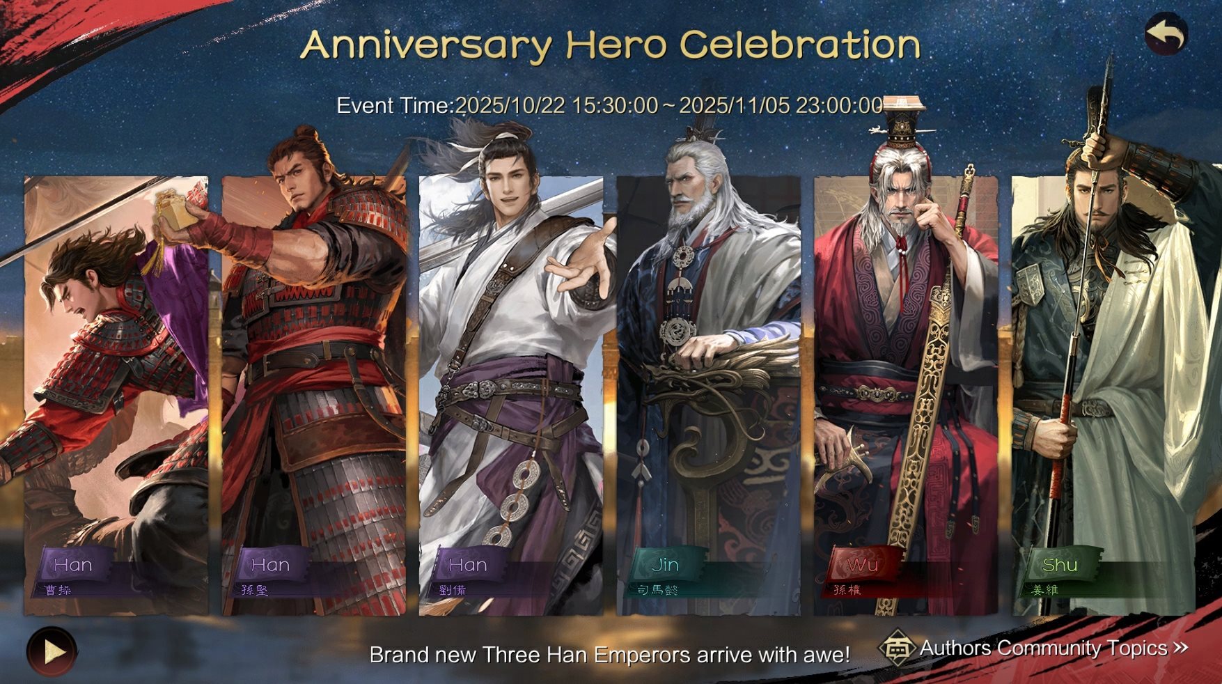 · After the anniversary celebration ends, newly launched S1 servers will still feature the exclusive "Stay True to Your Vision" event. Lords new to INFINITE BORDERS can still select one permanent 5★ Han Hero (Cao Cao, Sun Jian, or Liu Bei) through the event.