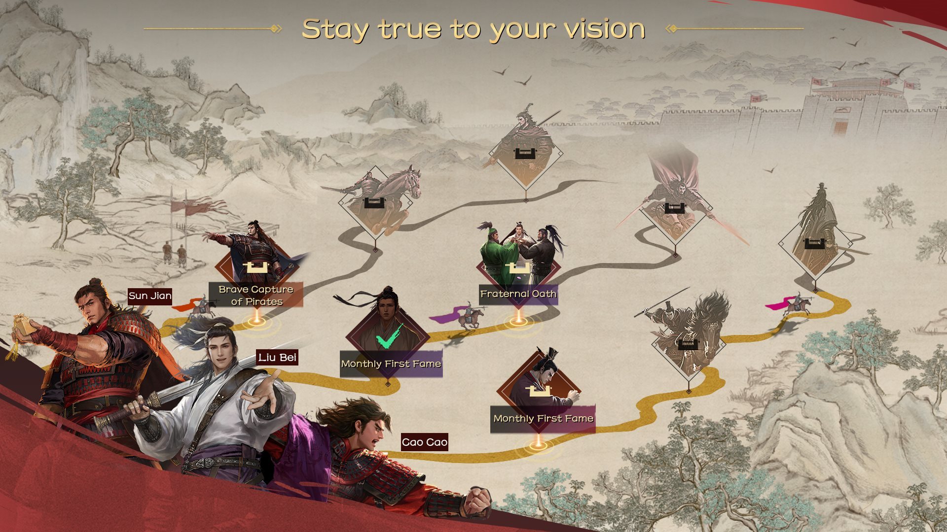 · Unlock 1 stage daily by logging in, where Lords can relive the early years of Cao Cao, Sun Jian, and Liu Bei, revisiting their early visions.