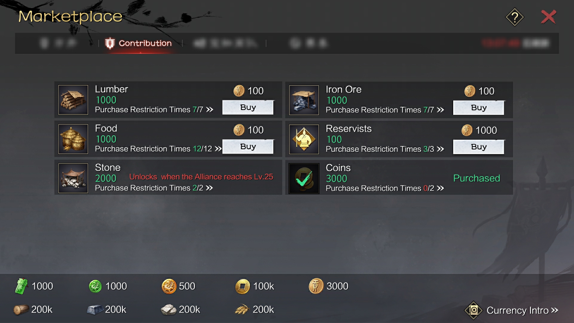 After Lords of the Legends Force create or join an Alliance, members can access the Contribution Marketplace via Domestic Affairs - Marketplace - Contribution tab or the Marketplace button on the Alliance page. Lords who become Guerrillas or Peach Land Soldiers mid-season will not have access to the Contribution Marketplace.