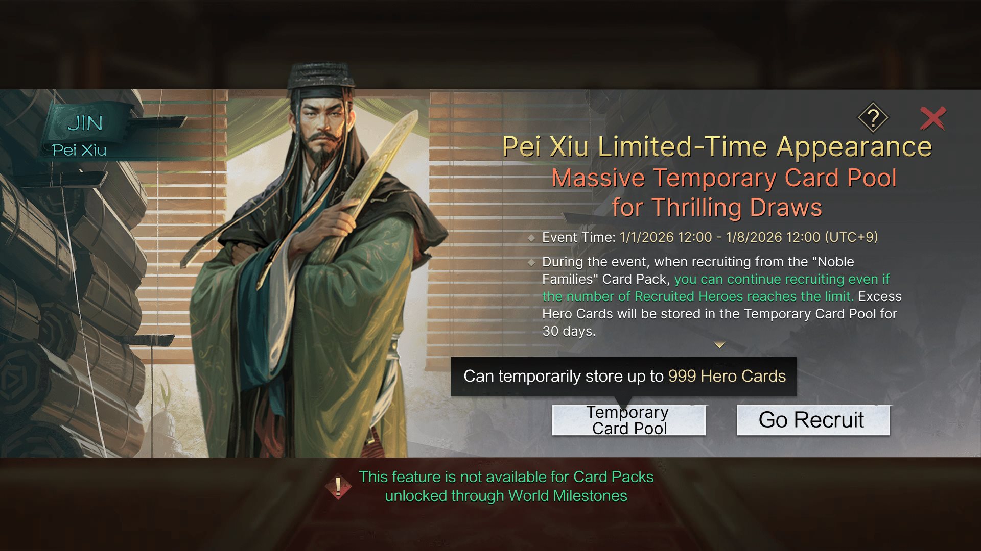·Additionally, when the Noble Families Card Packs become available, a Temporary Card Pool event will also be activated. During the event, when recruiting from the "Noble Families" Card Pack, you can continue recruiting even if the number of Recruited Heroes reaches the limit. Excess Hero Cards will be stored in the Temporary Warehouse for 30 days