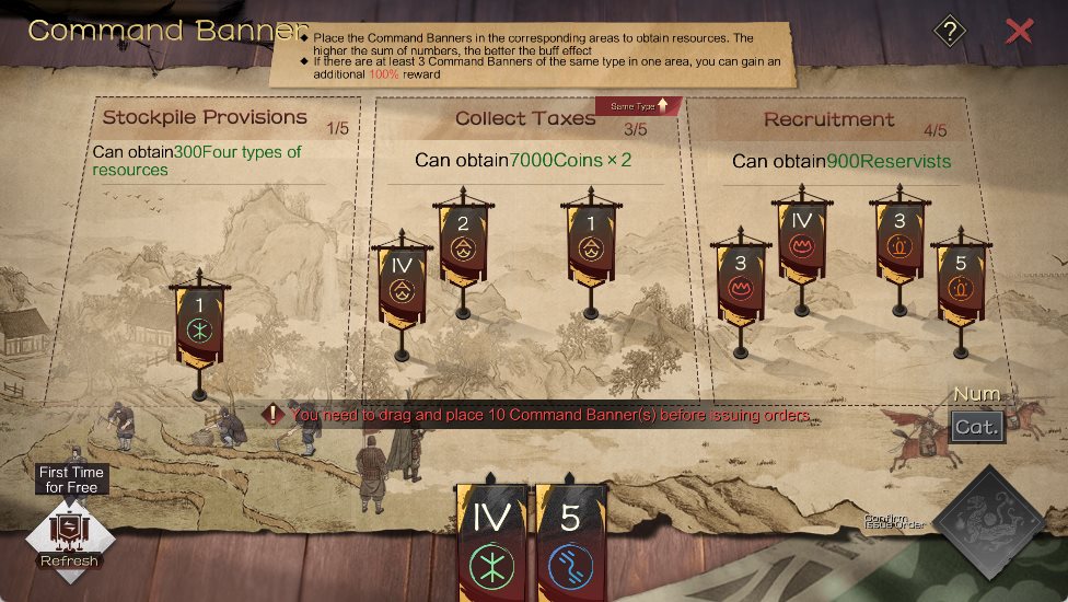 ·If 3 Banners of the same type (Metal/Wood/Water/Fire/Earth) are allocated to the same target, the resources, Coins, or Reservists obtained will be doubled.