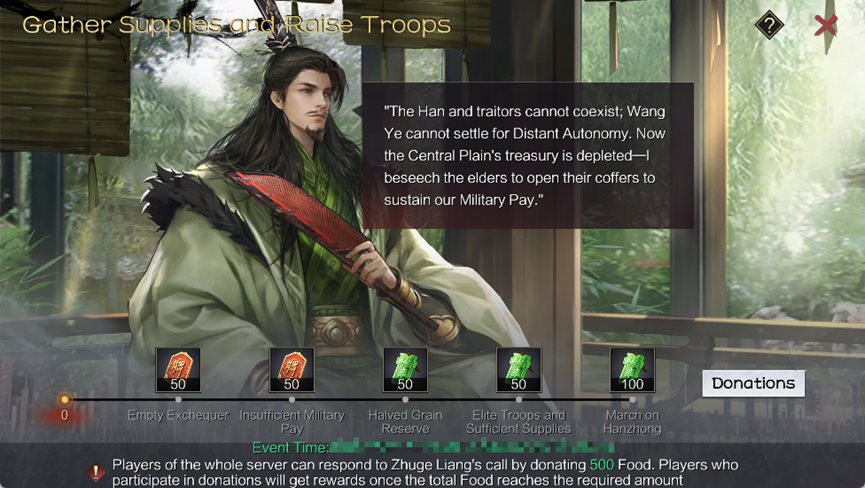 · During the event, all Lords can respond to Zhuge Liang's call and donate 500 Food. Each Lord can donate once.