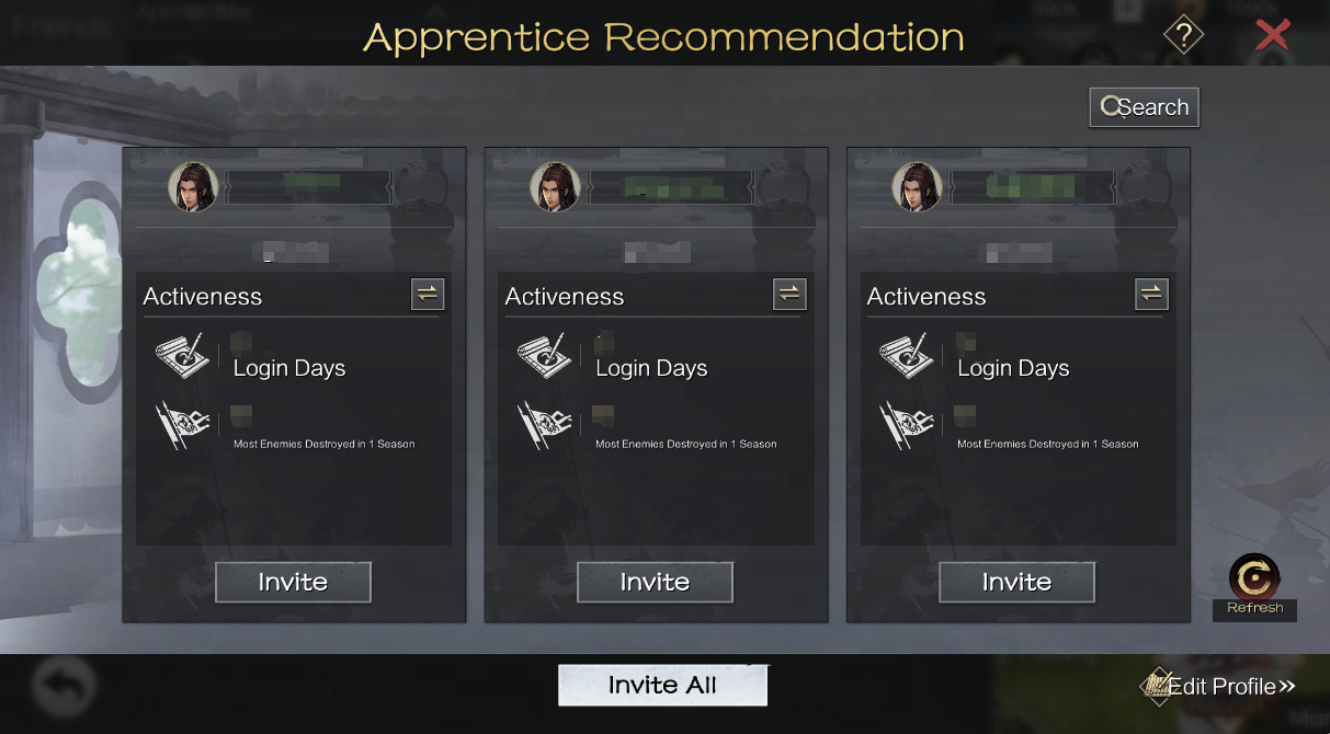 After the Master-Apprentice System is launched, characters with a Season count >3 and a Historical Force Value ≥20,000 will automatically become Masters and can recruit characters with a Season count ≤3 and a Force Value ≥200 as Apprentices to pass on their EXP. The Lord can send an application to the other party, and upon approval, the two will form a Master-Apprentice Relation.