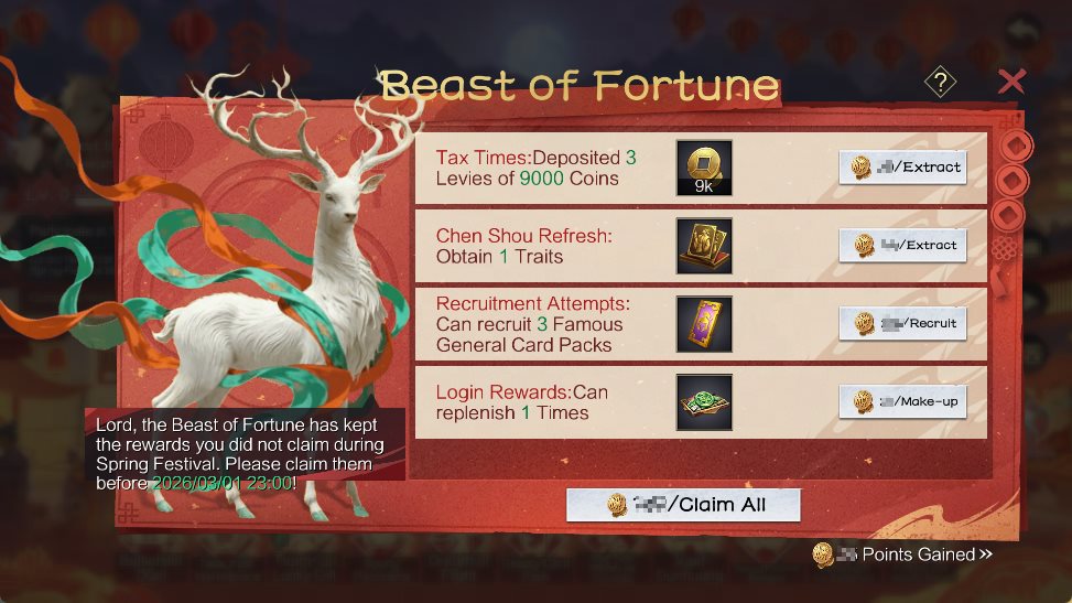 - Rewards not claimed during the Spring Festival can be retrieved using Spring Festival Points.