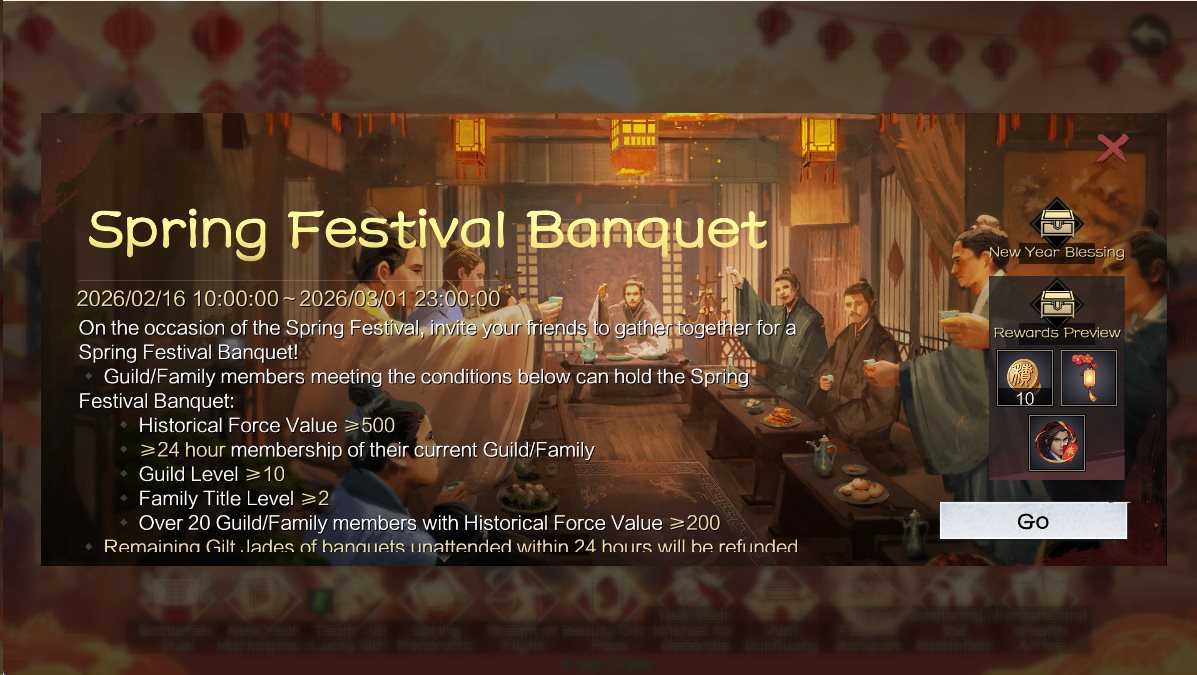 · Eligible Alliance/Assembly/Lineage/Family members can spend Gilt Jades to hold a Spring Festival Banquet